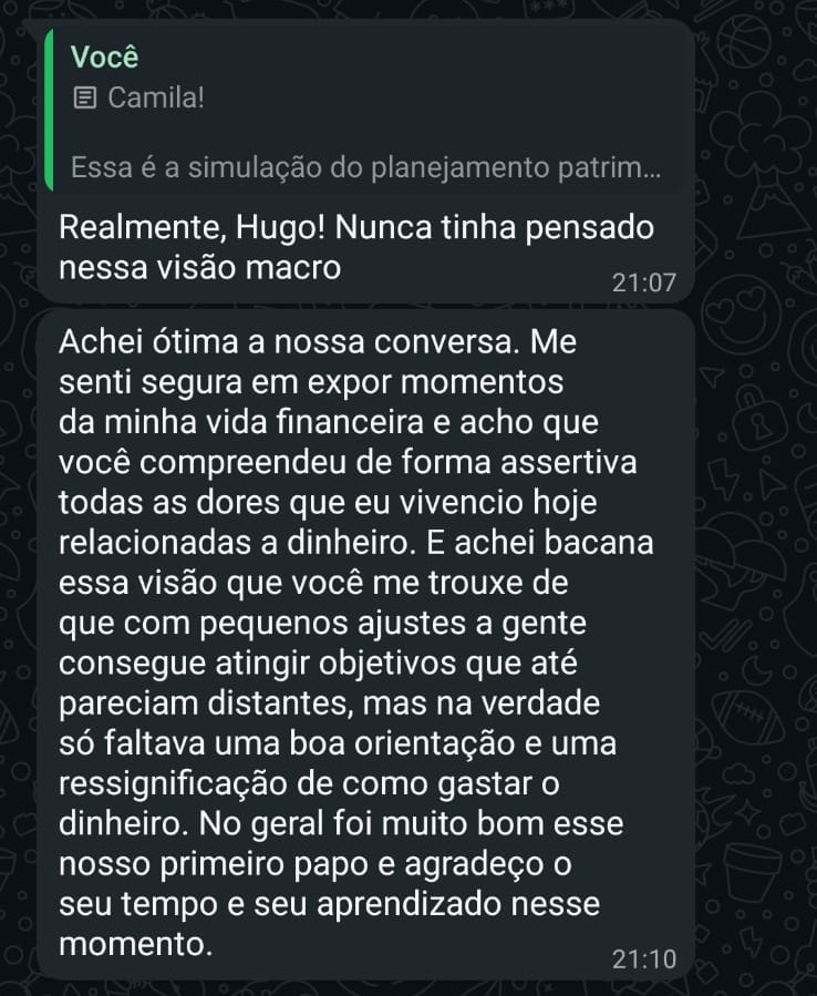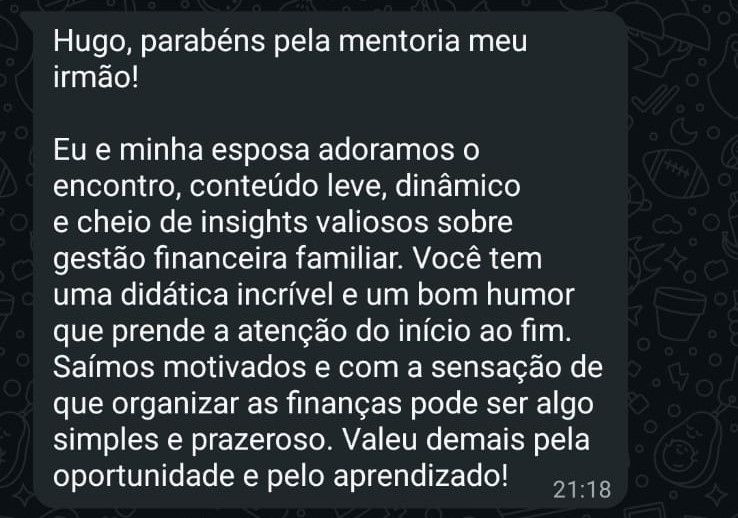 Eu me chamo Hugo, sou consultor financeiro independente desde 2019, e minha missão é te guiar em uma jornada de transformação da sua relação com o dinheiro. Acredito que o aprendizado financeiro não acontece apenas através dos números e planilhas, mas também lidando com suas emoções, comportamentos e decisões. Agora que me descobriu, você tem duas opções: seguir fazendo as coisas como sempre fez ou tentar algo novo. Juntos vamos criar possibilidades de construir um futuro financeiramente saudável, com clareza, autonomia e propósito. Você precisa entender que liberdade financeira não começa no valor que sobra mês a mês, mas na consciência sobre o que se quer da vida e na coragem de assumir o seu próprio caminho.